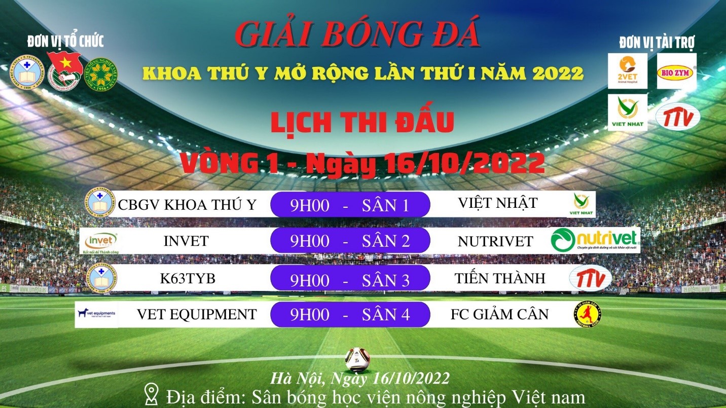 Giải bóng đá khoa Thú Y mở rộng lần thứ nhất diễn ra từ 16/10/2022 – 13//11/ 2022 với sự tham gia của đội tuyển đến từ cán bộ giảng viên khoa Thú Y, sinh viên khoa Thú Y và các đơn vị công ty trong lĩnh vực thú y.