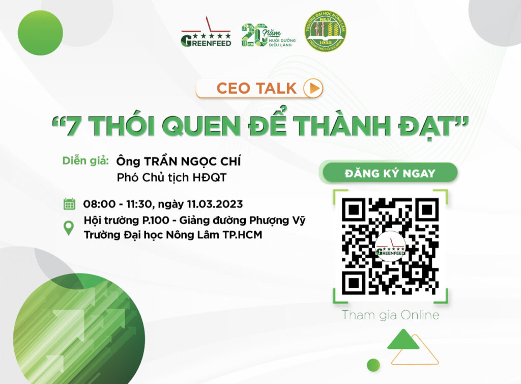Chương trình CEO TALK “7 THÓI QUEN ĐỂ THÀNH ĐẠT” với sự dẫn dắt của diễn giả, Ông Trần Ngọc Chí – là nhà đồng sánglập Tập đoàn GREENFEED Việt Nam và hiện giữ vị trí Phó Chủtịch Hội đồng Quản trị.