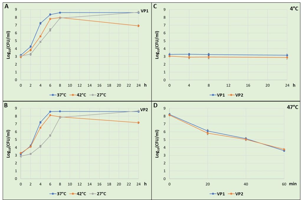 Ghi chú: Đường cong sinh trưởng của V. parahaemolyticus chủng VP1 (A) và VP2 (B) ở 27, 37, 42°C; Khả năng tồn tại của V. parahaemolyticus (chủng VP1 và VP2) ở 4°C (C) và ở 47°C (D); error bars – SD