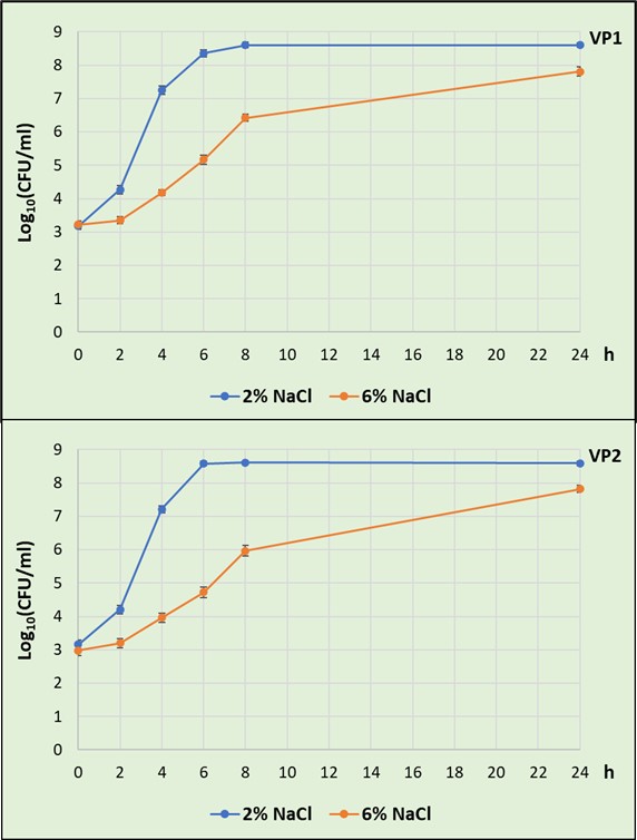Kết quả thử nghiệm khả năng sinh trưởng và tồn tại của V. parahaemolyticus ở các nồng độ muối NaCl cho thấy vi khuẩn này sinh trưởng tốt nhất ở nồng độ 2% NaCl (Hình 2). Ở nồng độ 6% NaCl, V. parahaemolyticus phát triển kém hơn; còn ở nồng độ 10% NaCl, V. parahaemolyticus không sinh trưởng, số lượng vi khuẩn giảm theo thời gian.