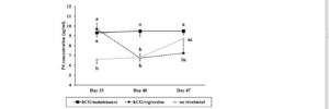 Vào ngày thứ 33, nồng độ P4 ở bò cái được tiêm hCG (thể vàng phụ tồn tại/ thể vàng phụ thoái hóa) cao hơn ở bò cái không được tiêm hCG (P <0,05). Nồng độ P4 trong nhóm bò cái có thể vàng phụ tồn tại luôn duy trì ở mức cao trong suốt giai đoạn theo dõi. Ngược lại, nồng độ P4 huyết thanh trong nhóm thể vàng phụ thoái hóa giảm dần từ ngày 33 đến ngày 47 (P <0,05). Mặt khác, trong nhóm bò không tiêm hCG, nồng độ P4 trong huyết thanh tăng từ ngày thứ 33 đến Ngày thứ 47 (P <0,05). Nồng độ P4 ngày thứ 40 trong nhóm bò có thể vàng phụ cao hơn nhóm bò không tiêm hCG và nhóm bò có thể vàng phụ thoái hóa. Nồng độ P4 ngày thứ 47 nhóm có thể vàng phụ cao hơn nhóm thể vàng phụ thoái hóa (P < 0.05).