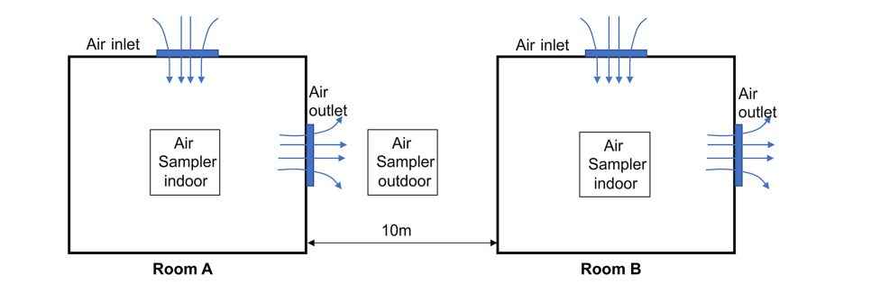 Hình 1. Sơ đồ các khu vực lấy mẫu liên quan đến đương đi của không khí tại chuồng lợn dương tính với ASFV