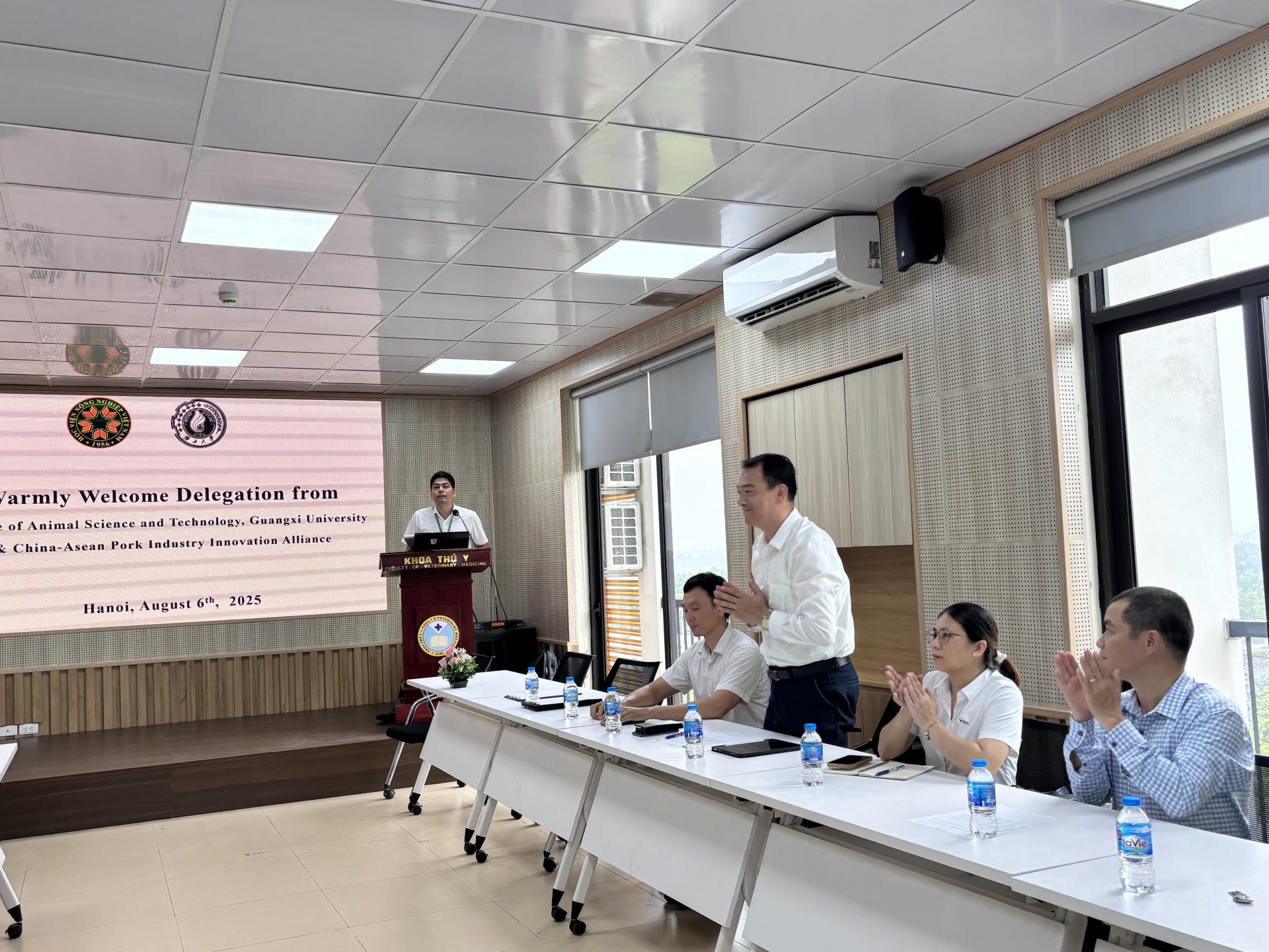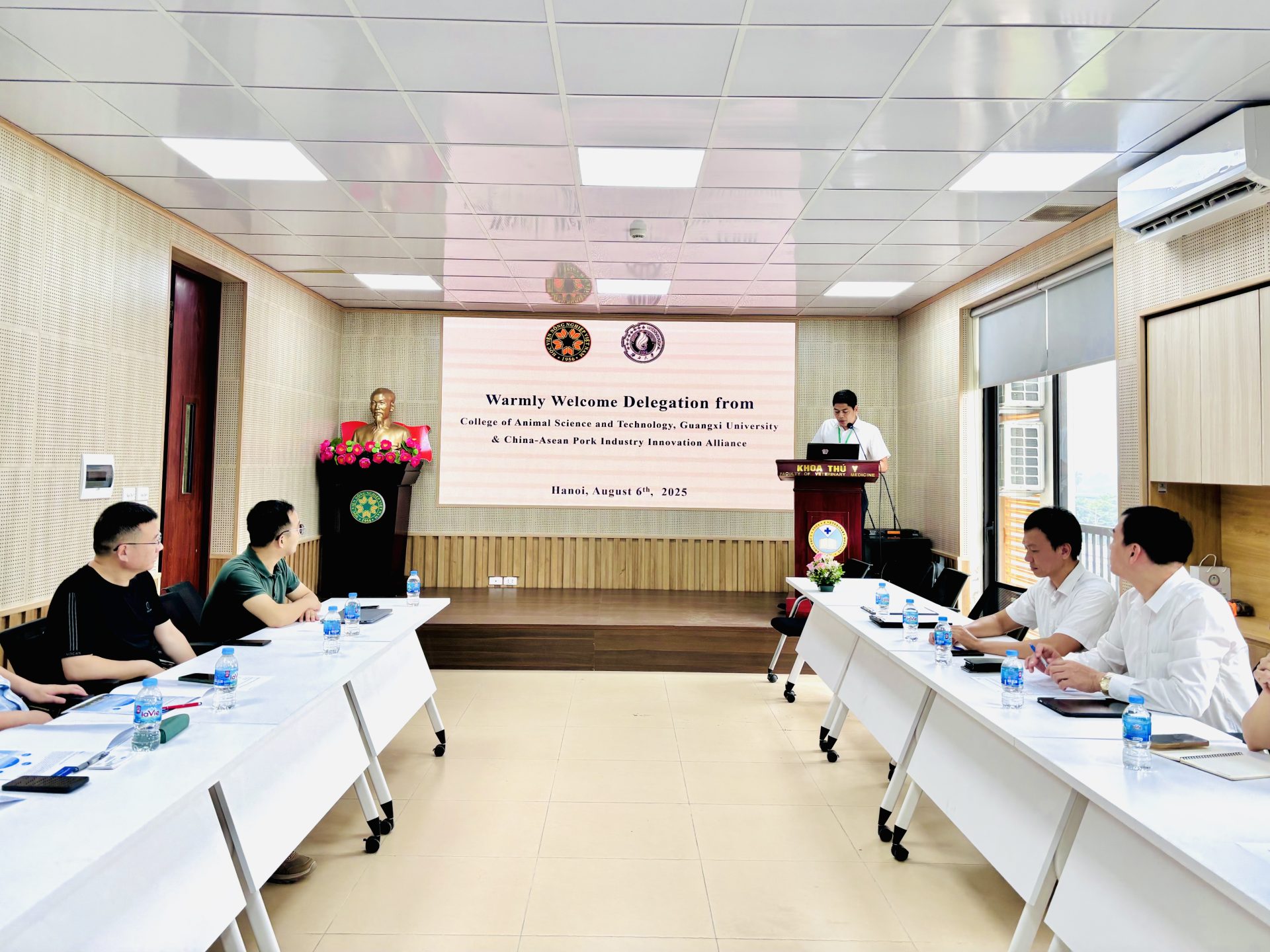 Sáng ngày 06 tháng 8 năm 2025, tại Khoa Thú y – Học viện Nông nghiệp Việt Nam đã diễn ra buổi làm việc và trao đổi hợp tác với đại diện Liên minh Đổi mới ngành Công nghiệp Thịt lợn Trung Quốc–ASEAN và trường Đại học Quảng Tây, Trung Quốc. Đây là hoạt động quan trọng nhằm tăng cường hợp tác quốc tế trong lĩnh vực thú y và chăn nuôi, đặc biệt là ngành công nghiệp thịt lợn – một lĩnh vực có tiềm năng phát triển mạnh mẽ tại khu vực Đông Nam Á và Trung Quốc.