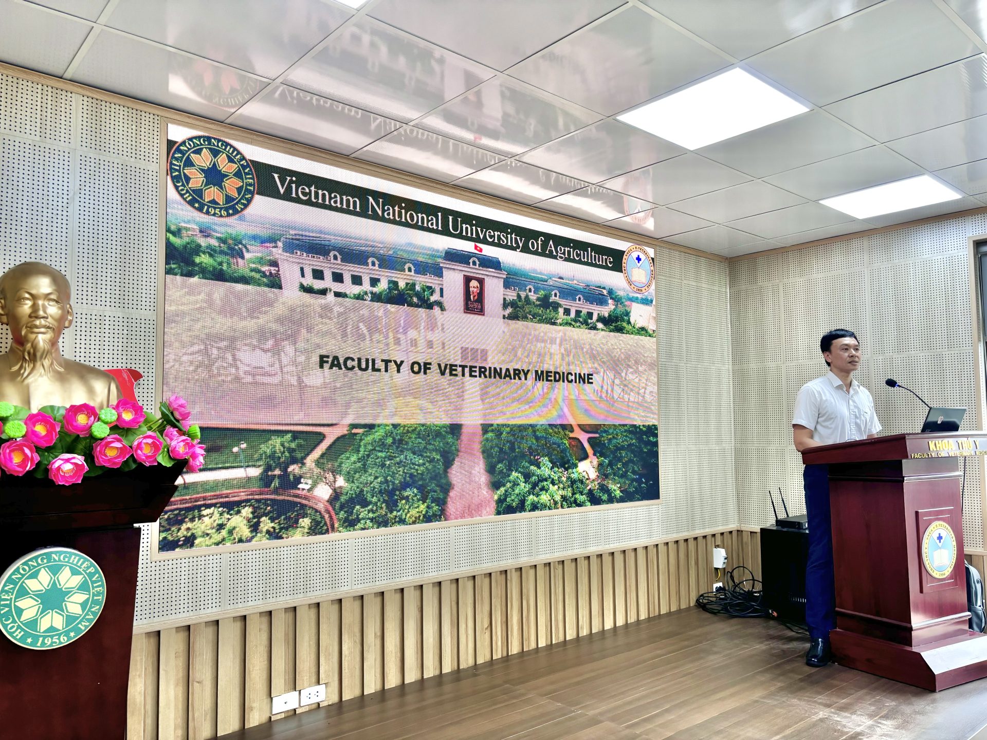 Tiếp tục chương trình, PGS.TS. Nguyễn Hoài Nam đã giới thiệu tổng quan về Học viện và Khoa Thú y, nhấn mạnh vai trò và thành tựu nổi bật của Khoa Thú y trong đào tạo, nghiên cứu và chuyển giao khoa học công nghệ trong lĩnh vực thú y và chăn nuôi. Khoa Thú y hiện là một trong những đơn vị đào tạo thú y hàng đầu cả nước, đồng thời là đối tác tin cậy trong nhiều chương trình hợp tác với các tổ chức, trường đại học và doanh nghiệp quốc tế.