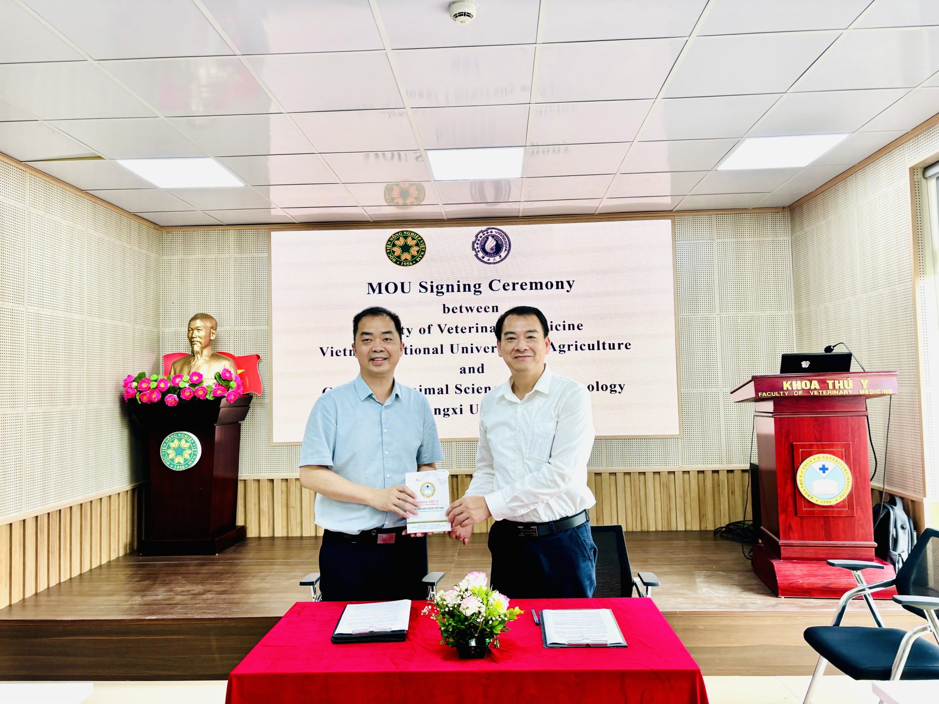 Kết thúc chương trình, các đại biểu đã cùng nhau chụp ảnh lưu niệm và trao quà lưu niệm giữa hai bên. Đại diện Khoa Thú y, PGS.TS. Bùi Trần Anh Đào và GS. Lu Yangqing – đại diện phía bạn, đã thực hiện nghi thức trao quà trong tinh thần hợp tác hữu nghị.