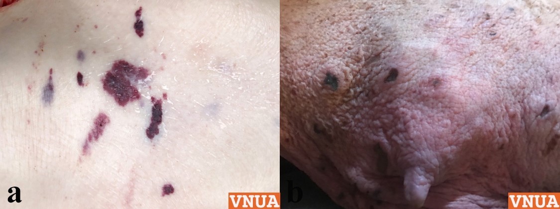 - a. Xuất huyết thành mảng dưới da; b. Tím tái, hoại tử trung tâm trên vùng da mỏng