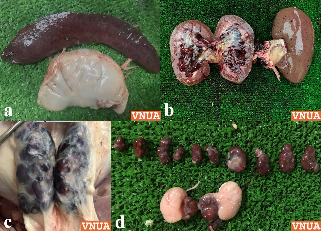 - Lách phì đại nằm vắt ngang xoang bụng; b. Thận xuất huyết điểm nghiêm trọng; c và d. Hệ thống hạch lympho xuất huyết nghiêm trọng