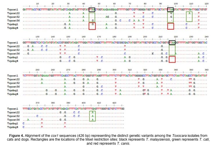 Tất cả 127 mẫu giun trưởng thành đều được khuếch đại thành công đoạn gen cox1 có kích thước khoảng 430 bp. Sau khi phân tách bằng enzyme MseI, chúng tôi đã thu được 6 mô hình khác nhau. Dựa vào kết quả giải trình tự gen đã xác định được ba loài giun đũa ký sinh trên chó mèo gồm T. canis – loài duy nhất ký sinh trên chó, T. cati và T. malaysiensis ký sinh trên mèo.