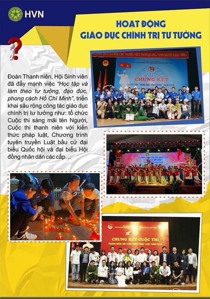 ?? Công tác chính trị, tư tưởng sinh viên là một vấn đề lớn, luôn nhận được sự quan tâm của Đảng ủy, Ban Giám đốc Học viện Nông nghiệp Việt Nam. Sinh viên sẽ được tham gia các hoạt động đa dạng, phong phú bên cạnh các học phần Khoa học chính trị như: