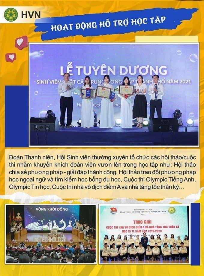 ?Học viện Nông nghiệp Việt Nam xây dựng hệ thống hoạt động hỗ trợ học tập phong phú. Sinh viên sẽ được tiếp cận và tham gia những hội thảo, cuộc thi. Các hoạt động hỗ trợ học tập do chương trình thiết kế hết sức đa dạng có thể kể đến như: