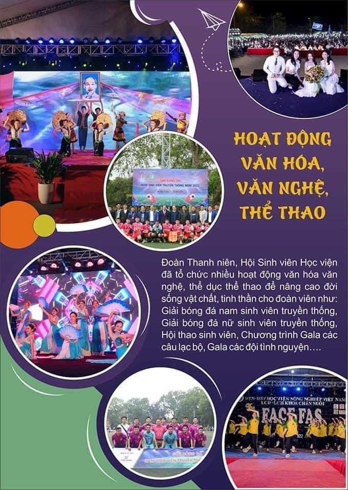 ? Ngoài những hoạt động giáo dục và công tác chính trị, Học viện Nông nghiệp Việt Nam cũng rất chú trọng quan tâm đến các hoạt động văn hoá – văn nghệ. Đoàn Thanh niên, Hội Sinh viên Học viện đã tổ chức nhiều hoạt động văn hóa văn nghệ, thể dục thể thao để nâng cao đời sống vật chất, tinh thần cho đoàn viên như: Giải bóng đá nam sinh viên truyền thống, Giải bóng đá nữ sinh viên truyền thống, Hội thao sinh viên, Chương trình Gala các câu lạc bộ, Gala các đội tình nguyện….