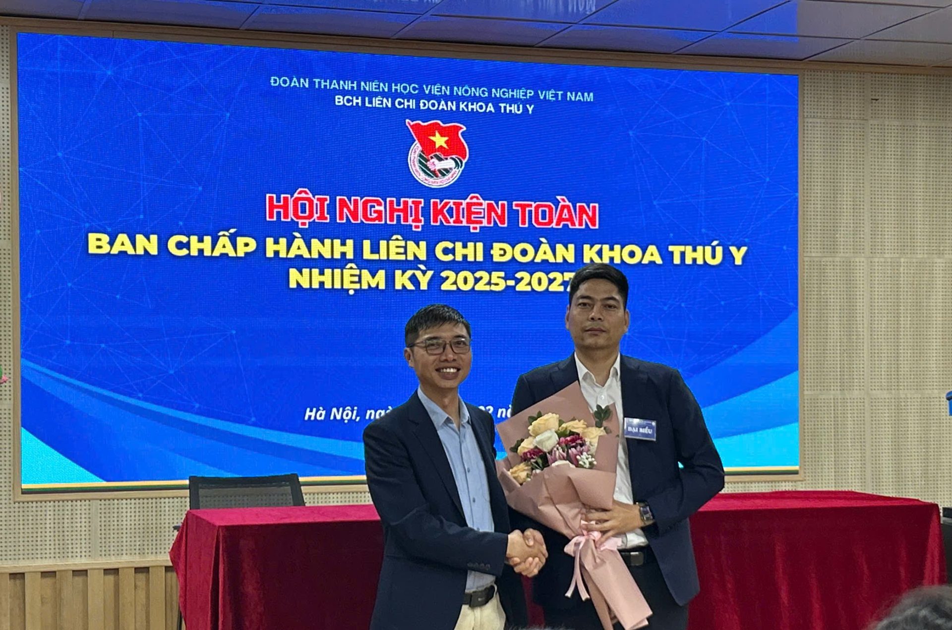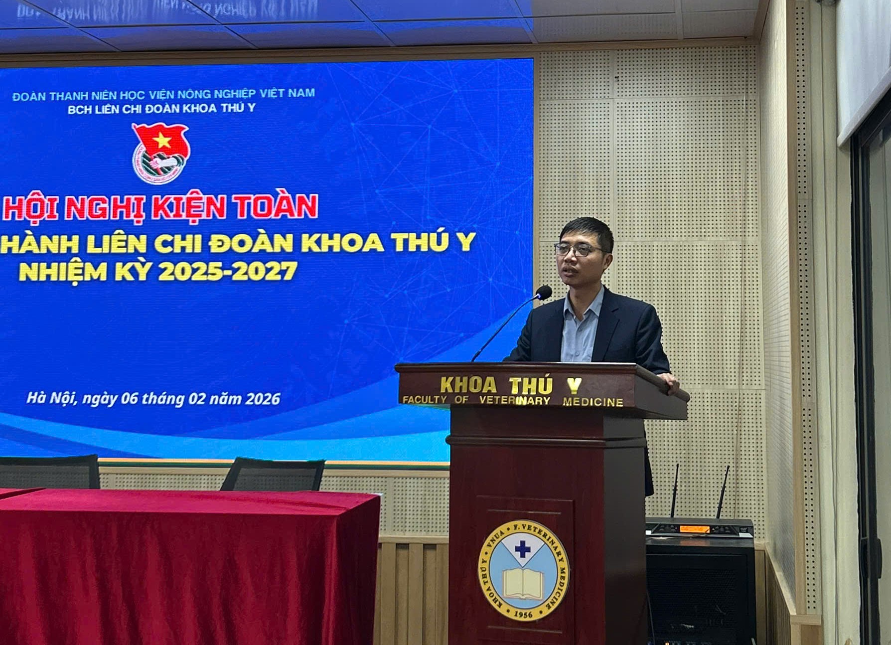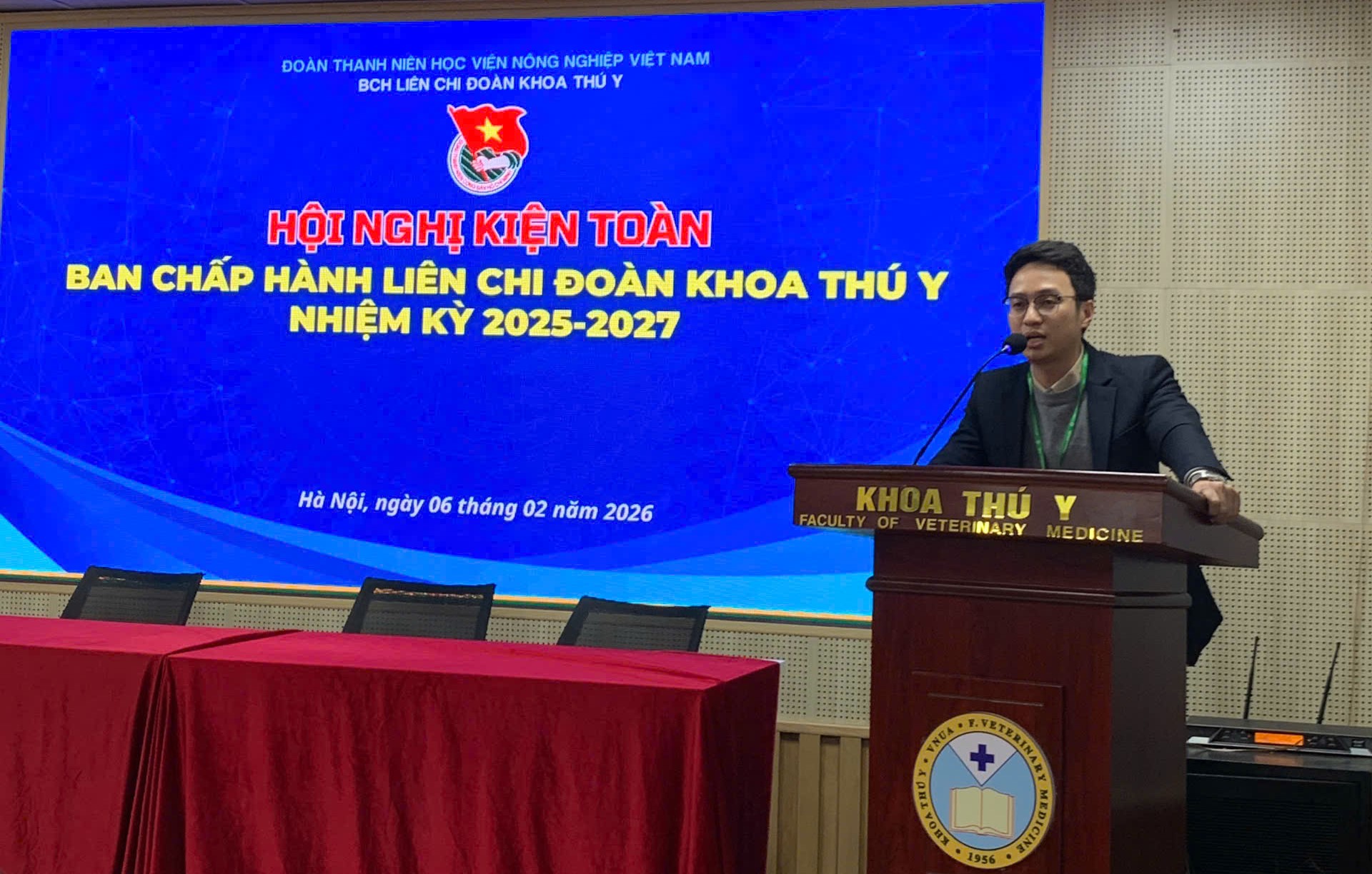 Được sự đồng ý của Chi ủy và Ban Chủ nhiệm Khoa Thú y, vào hồi 18h00 ngày 06/02/2026, Liên Chi đoàn Khoa Thú y – Học viện Nông nghiệp Việt Nam đã long trọng tổ chức Hội nghị kiện toàn Ban Chấp hành Liên chi đoàn Khoa Thú y nhiệm kỳ 2025–2027 trong không khí trang trọng, dân chủ và đoàn kết. Tham dự và chỉ đạo Hội nghị, về phía Đoàn Thanh niên Học viện Nông nghiệp Việt Nam có TS. Phan Xuân Tân – Ủy viên Ban Thường vụ Đoàn Thanh niên Học viện. Về phía Chi ủy, Ban Chủ nhiệm Khoa Thú y có TS. Đặng Hữu Anh – Phó Bí thư Chi bộ Khoa Thú y. Về phía Liên chi đoàn Khoa Thú y có các đồng chí: ThS. Vũ Đức Hạnh – Bí thư Liên chi đoàn; TS. Bùi Văn Dũng và đồng chí Trần Văn Phúc – Phó Bí thư Liên chi đoàn; cùng các đoàn viên đang tham gia công tác Đoàn và đại diện các Câu lạc bộ trực thuộc Khoa Thú y.