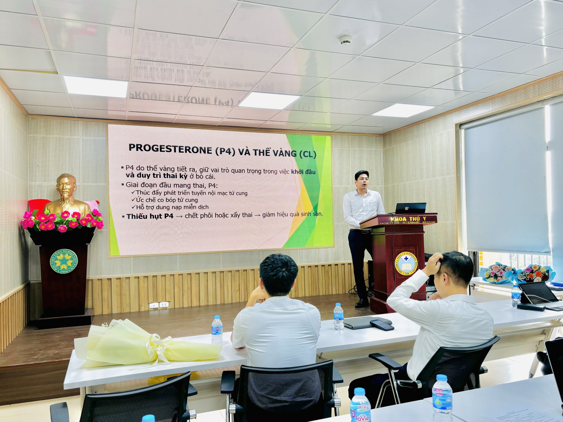 Phần tiếp theo của hội nghị là loạt báo cáo khoa học chuyên đề đến từ bốn nhóm nghiên cứu cán bộ tiêu biểu, mỗi báo cáo kéo dài 20 phút và thu hút sự quan tâm đặc biệt từ các đại biểu. Báo cáo đầu tiên đến từ Nhóm nghiên cứu tinh hoa về vắc-xin và chế phẩm sinh học với đề tài “Emergence of Recombinant African Swine Fever Virus Genotypes I/II in Domestic Pigs, Vietnam, 2023”, cung cấp dữ liệu cảnh báo sự xuất hiện của chủng virus tái tổ hợp nguy hiểm trong đàn lợn nuôi. Báo cáo thứ hai của Nhóm nghiên cứu mạnh Kháng kháng sinh và chế phẩm sinh học thay thế trình bày kết quả “Nghiên cứu đặc điểm sinh học phân tử của Duck Circovirus ở vịt nuôi tại một số tỉnh miền Bắc Việt Nam (2021–2024)”, trong đó phân tích đặc điểm gene và biểu hiện bệnh của virus gây ảnh hưởng lớn đến chăn nuôi vịt. Tiếp theo là báo cáo “Ứng dụng phản ứng RT-LAMP trong chẩn đoán virus Tembusu” do Nhóm nghiên cứu mạnh Vi sinh vật và bệnh truyền nhiễm thú y trình bày, đề xuất một phương pháp chẩn đoán nhanh, rẻ tiền và có khả năng ứng dụng thực tiễn cao. Cuối cùng là báo cáo của Nhóm nghiên cứu xuất sắc Công nghệ phôi và tế bào với đề tài “Mối quan hệ giữa việc duy trì thể vàng phụ và protein B đặc hiệu thai kỳ ở bò đen Nhật Bản mang thai”, mở ra những gợi ý tiềm năng trong việc nâng cao hiệu quả sinh sản ở giống bò cao sản.