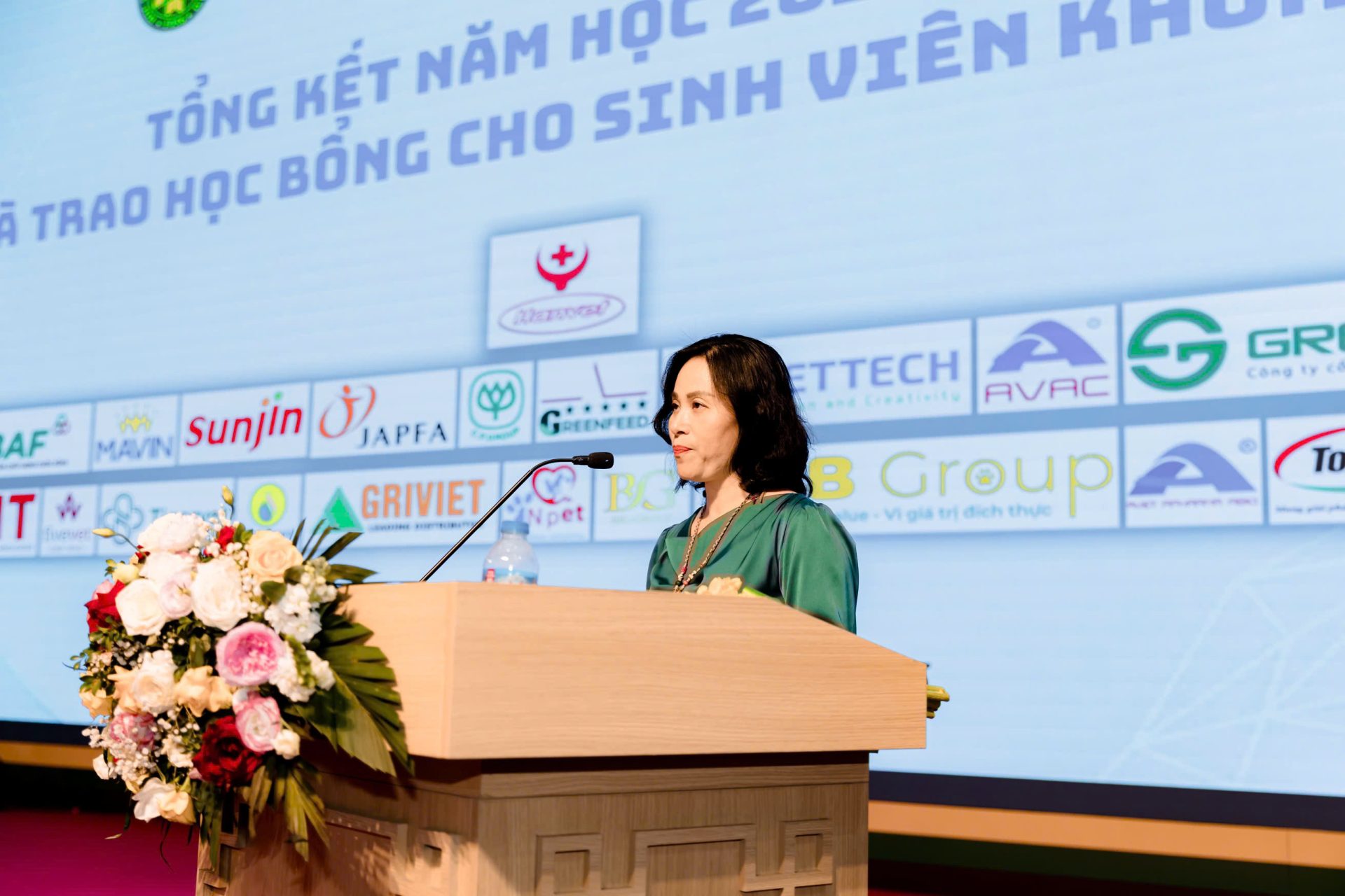 PGS.TS. Bùi Trần Anh Đào cũng nhấn mạnh rằng thành công của Khoa có được là nhờ sự đồng hành và hỗ trợ quan trọng từ cộng đồng doanh nghiệp. Thay mặt Khoa, thầy gửi lời cảm ơn chân thành đến các đơn vị đã tài trợ học bổng. Trưởng Khoa chia sẻ, sự hỗ trợ này không chỉ có giá trị vật chất, mà còn là “sự ghi nhận cho nỗ lực của sinh viên, là nguồn động lực tinh thần to lớn, và quan trọng hơn, đó là sự đầu tư thiết thực cho tương lai của ngành thú y Việt Nam”. Thầy cũng chúc mừng các sinh viên nhận học bổng và mong các em xem đây là động lực để tiếp tục rèn luyện, nâng cao cả về “chuyên môn” lẫn “đạo đức nghề nghiệp”, giữ vững hoài bão để cống hiến cho xã hội.