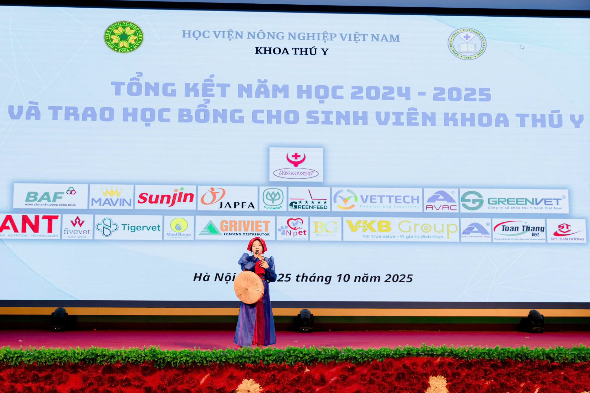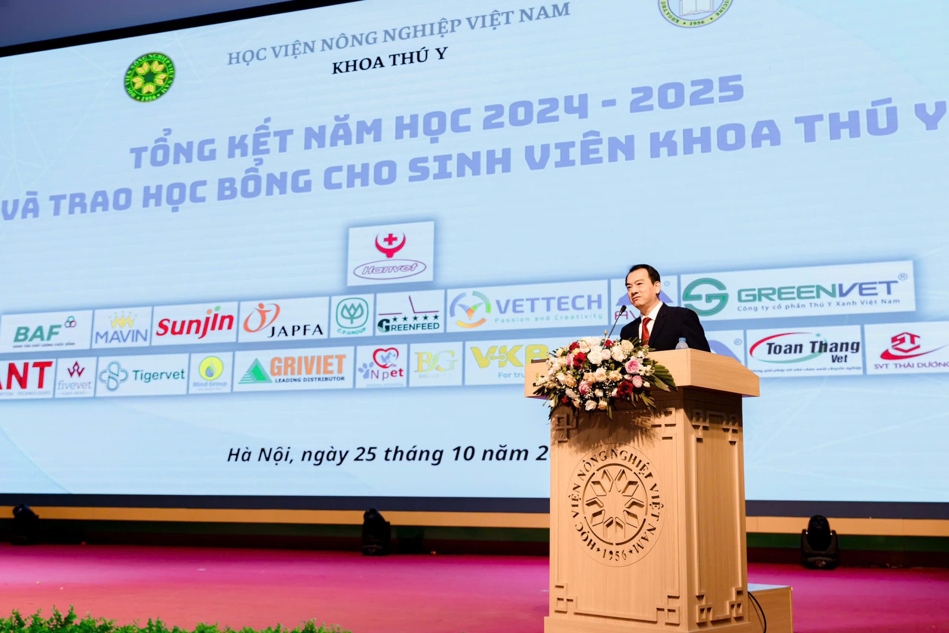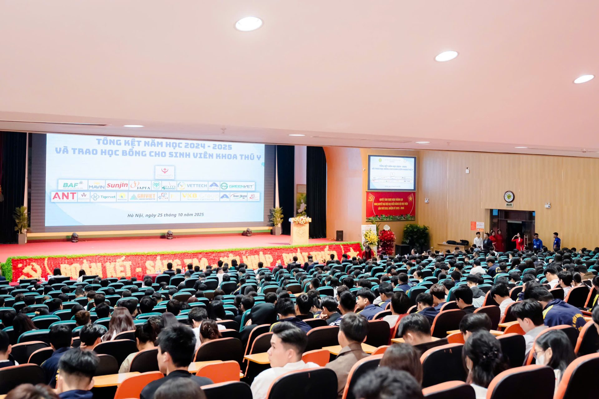 Ngày 25/10/2025, trong không khí trang trọng tại Hội trường Trung Tâm, Khoa Thú y – Học viện Nông nghiệp Việt Nam đã long trọng tổ chức “Lễ tổng kết năm học 2024-2025 và trao học bổng sinh viên”. Hướng tới kỷ niệm 43 năm Ngày Nhà giáo Việt Nam và 70 năm thành lập Học viện, đây là thời khắc ý nghĩa để thầy và trò Khoa Thú y cùng nhìn lại một chặng đường nỗ lực, ghi nhận những thành quả đạt được và vinh danh những tấm gương sinh viên xuất sắc.