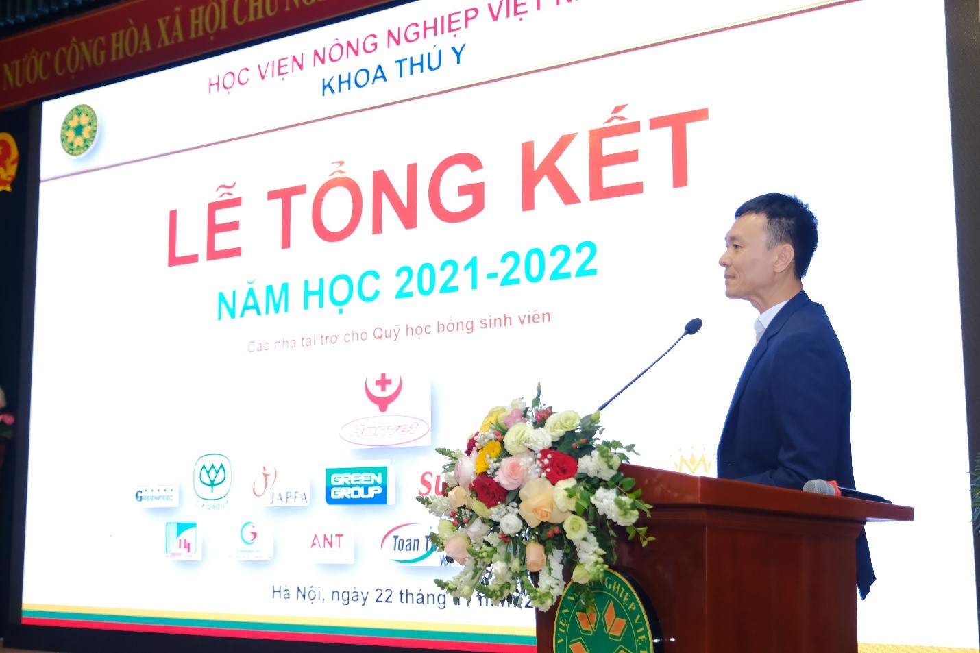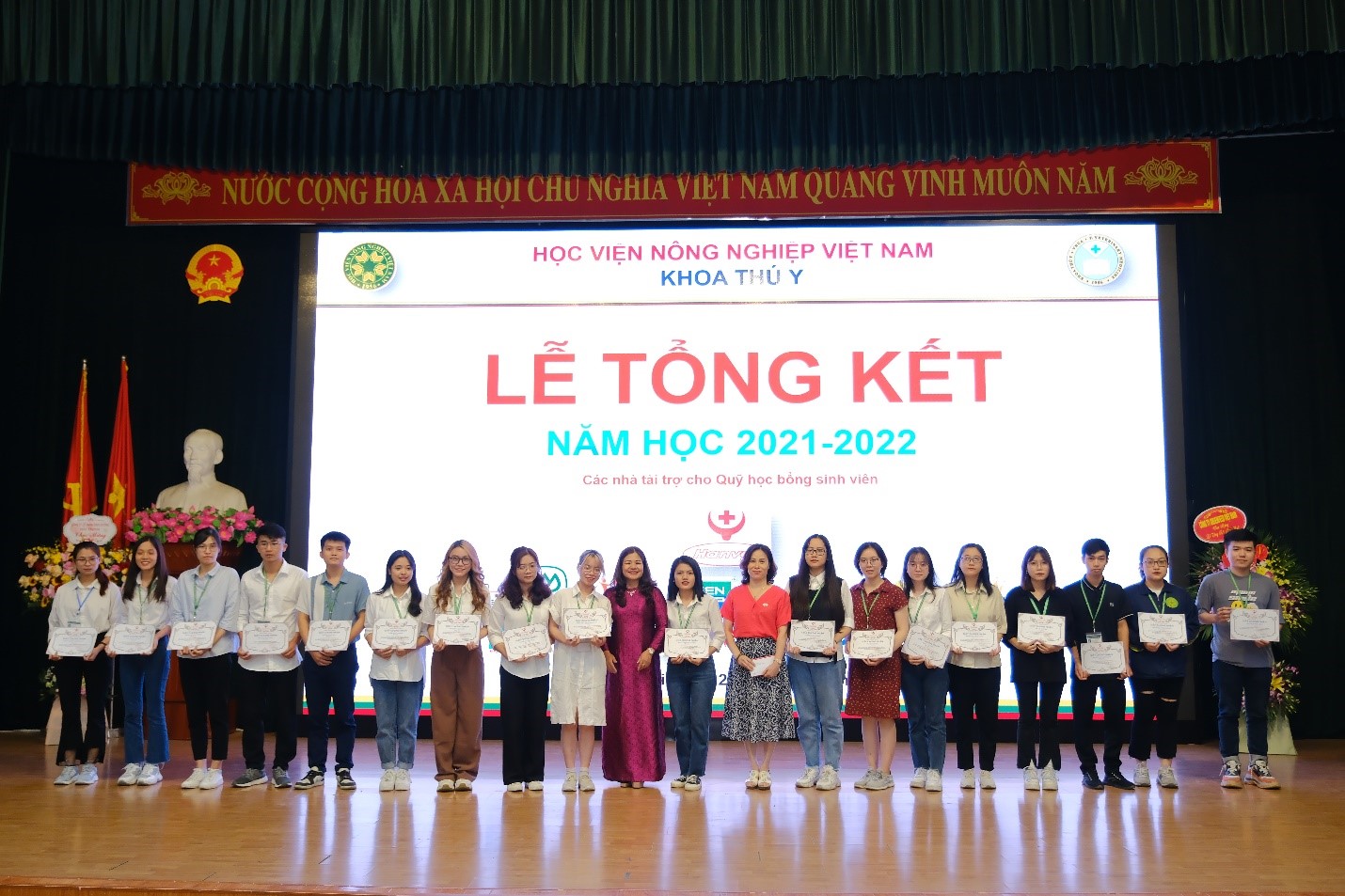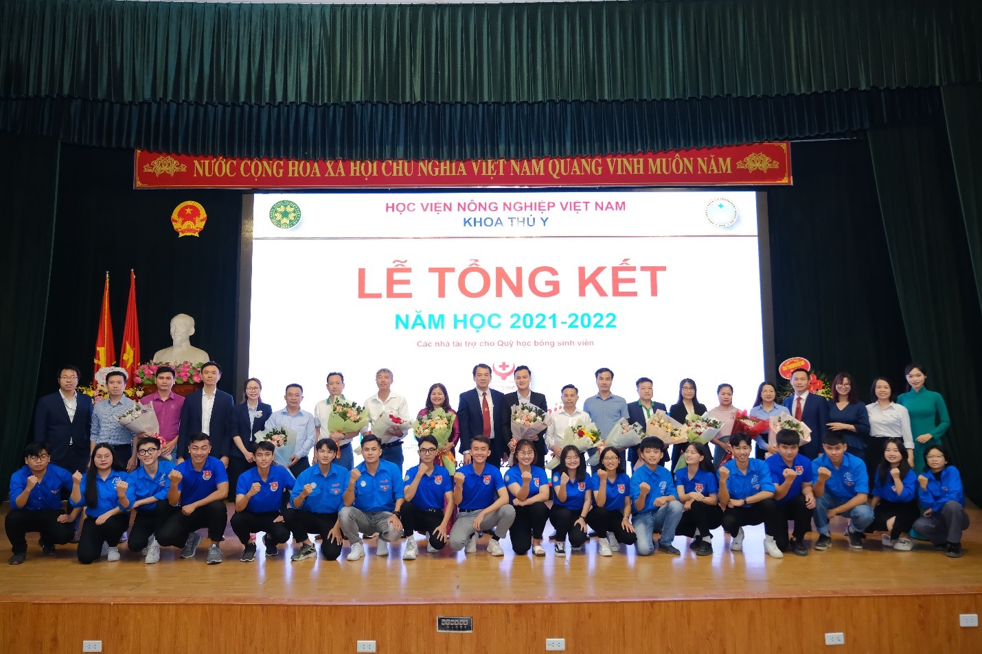 Hoà chung không khí kỷ niệm 40 năm ngày Nhà giáo Việt Nam (20/11/1982 – 20/11/2022), tối ngày 22/11/2022, Khoa Thú y long trọng tổ chức Lễ tổng kết năm học 2021 – 2022 tại Hội trường A (Nguyễn Đăng 207), nhằm tổng kết các phong trào học tập và công tác sinh viên trong năm học vừa qua; Trao học bổng cho sinh viên; Kịp thời động viên, khích lệ các bạn sinh viên có thành tích cao trong học tập, trong công tác Đoàn – Hội. Đây cũng là dịp để thầy trò cùng nhìn nhận lại những tồn tại khó khăn vướng mắc trong năm học vừa qua, đề ra phương hướng năm học mới 2022 – 2023.