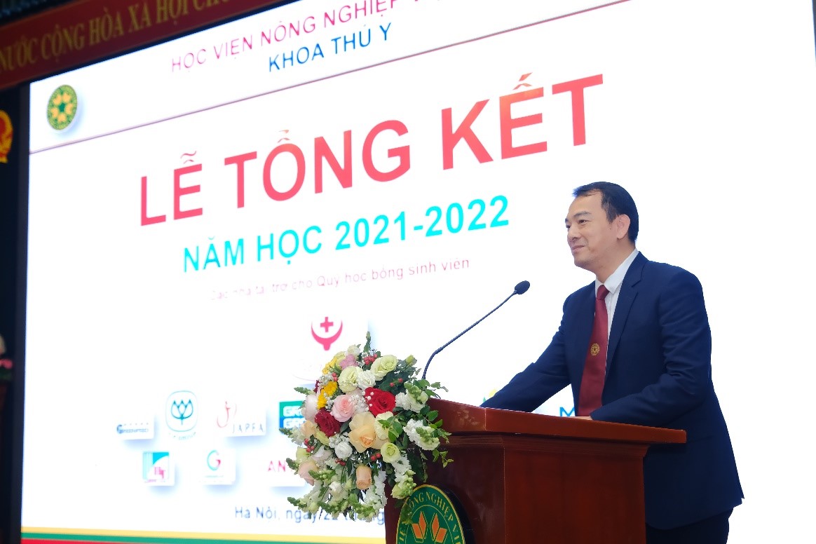 Tại buổi lễ, TS. Nguyễn Hoài Nam – Phó trưởng khoa Thú y đã trình bày Báo cáo tổng kết năm học 2021-2022 và một số nhiệm vụ trọng tâm năm học 2022 – 2023. Về đội ngũ cán bộ của khoa, các thầy cô đều được đào tạo bài bản tại các nước tiên tiến trên thế giới. Số lượng sinh viên tuyển hàng năm vào khoa luôn ổn định với chất lượng đầu vào ngày một nâng cao. Kết quả học tập sinh viên toàn khoa năm học 2020-2021 có những cải thiện đáng kể khi tỷ lệ sinh viên xuất sắc và sinh viên giỏi tăng lên, số sinh viên yếu và trung bình giảm. Các phong trào của Liên chi đoàn (LCĐ), Liên chi hội tiếp tục khẳng định là một trong những lá cờ đầu trong Học viện. Hiện nay, LCĐ triển khai nhiều cuộc thi là sân chơi bổ ích cho sinh viên như Vet Autumn, Sáng tạo video tiktok 2022, …Cùng với đó, các câu lạc bộ như: CLB Một sức khỏe – One Heath; CLB Tiếng Anh Khoa Thú y (Veterinary English Club); Trạm cứu hộ động vật Nông nghiệp;….giúp sinh viên trau dồi kiến thức chuyên môn, bồi dưỡng kỹ năng ngoại ngữ, kỹ năng mềm, hoàn thiện bản thân. Ngoài ra, Đội sinh viên tình nguyện Khoa Thú y với nhiều hoạt động thiết thực như Mùa hè xanh, Bát cháo tình thương, Đông ấm…đã nhiều lần được Đoàn Thanh niên của TP Hà Nội tuyên dương.