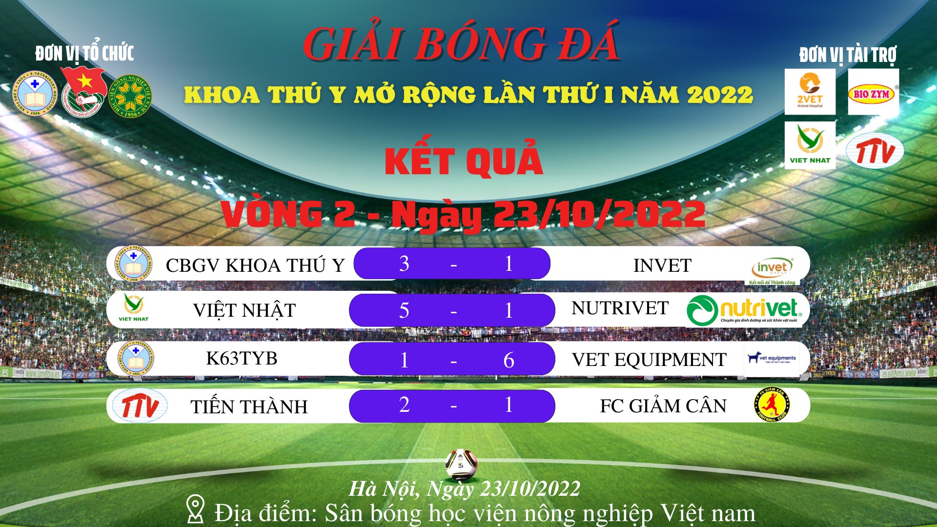 Ban tổ chức thông báo Lịch thi đấu “ Giải bóng đá khoa Thú Y mở rộng lần thứ nhất “ Kết thúc vòng 1 vào ngày 16/10/2022 với những trận đấu gay cấn và hấp dẫn Sau đây là kết quả của các đội ở vòng 1 Kèm ảnh kết quả.
