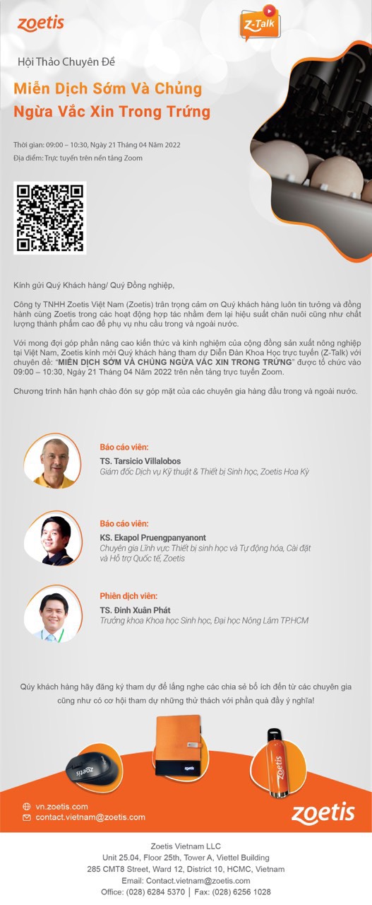 Diễn đàn được tổ chức bởi Zoetis Việt Nam với sự góp mặt của các chuyên gia lĩnh vực thiết bị sinh học từ các nước phát triển như TS. Tarsicio Villalobos – Giám đốc Dịch vụ Kỹ thuật & Thiết bị Sinh học, Zoetis Hoa Kỳ; Ông Ekapol Pruengpanyanont – Chuyên gia Lĩnh vực Thiết bị sinh học và Tự động hóa, Cài đặt và Hỗ trợ Quốc tế, Zoetis, qua phần phiên dịch của TS. Đinh Xuân Phát – Trưởng khoa Khoa học Sinh học, Đại học Nông Lâm TP.HCM hứa hẹn sẽ mang đến những thông tin hữu ích cho cộng đồng chăn nuôi gia cầm tại Việt Nam.