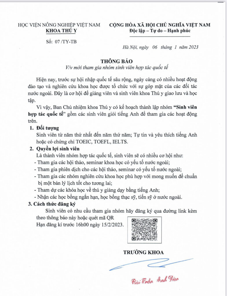 Tin tức Mời tham gia nhóm sinh viên hợp tác quốc tế Ngày đăng: 10/01/2023 by Khoa Thú y Tin cùng thể loại NGHIÊN CỨU ĐÁNH GIÁ ĐỘC LỰC CỦA CHỦNG VIRUS DỊCH TẢ LỢN CHÂU PHI VNUA – ASFV – L01 PHÂN LẬP TẠI TỈNH HÀ NAM – VIỆT NAM TRÊN LỢN THÍ NGHIỆM Dẫn kinh nghiệm từ Mỹ, Hà Lan, Israel, Giám đốc Học viện Nông nghiệp Việt Nam kiến nghị 5 giải pháp về khuyến nông Học viện Nông nghiệp Việt Nam trang trọng tổ chức Lễ bế giảng và trao bằng tốt nghiệp đại học, hệ chính quy năm 2025 KHẢ NĂNG ỨC CHẾ CỦA CHẾ PHẨM CAO THẢO DƯỢC VNUA-HERBAL EXTRACT MIXTURE FOR METRITIS CN–52/15 ĐỐI VỚI VI KHUẨN STAPHYLOCOCCUS SPP. VÀ STREPTOCOCCUS SPP. PHÂN LẬP TỪ DỊCH VIÊM TỬ CUNG LỢN NÁI SAU KHI ĐẺ VÀ KẾT QUẢ THỬ NGHIỆM ĐIỀU TRỊ KHOA THÚ Y TỔNG KẾT NĂM HỌC 2024-2025: THẮT CHẶT KẾT NỐI DOANH NGHIỆP, TRAO HỌC BỔNG GIÁ TRỊ CHO SINH VIÊN