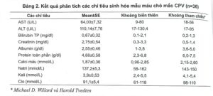 Gan thận của các con vật đều bị tổn thương thông qua kết quả men gan tăng AST= 64,00±7,32 U/L; ALT= 110,14±7,76 U/L; creatinin = 2,75±0,54. Giảm áp lực thể keo trong lòng mạch thể hiện ở các chỉ số albumin = 2,55±0,46 g/dl; protein tổng số = 4,68±0,58 g/dl. Chó mắc CPV bị mất cân bằng điện giải khi các chỉ số điện giải xuống thấp: calci = 1,87±0,36 mmol/l; natri = 137,2±5,3 mmol/l; kali = 3,9±0,53 mmo/l; clo = 91,1±5,4 mmol/l.