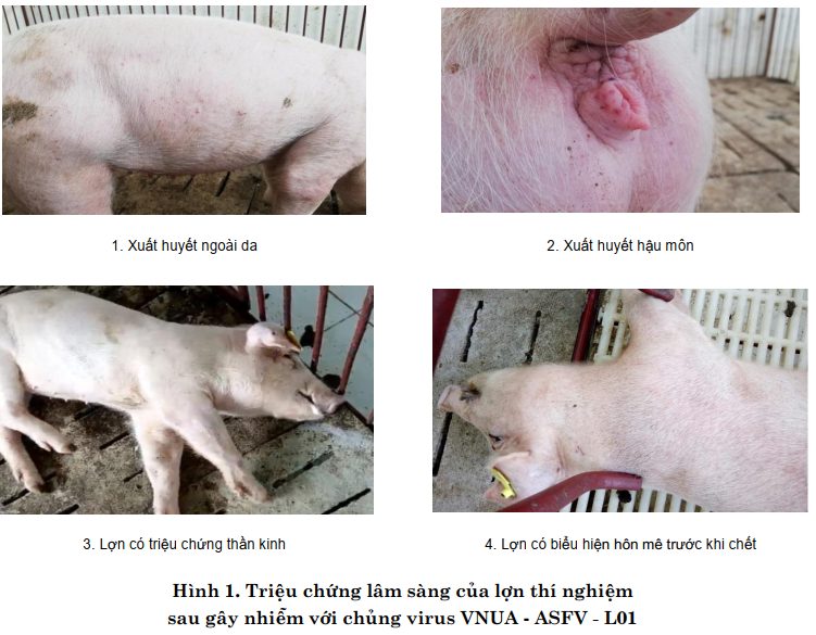 Kết quả nghiên cứu: Kết quả nghiên cứu cho thấy, sau khi gây nhiễm với chủng virus VNUA – ASFV – L01, tất cả lợn thí nghiệm đều xuất hiện triệu chứng lâm sàng điển hình của dịch tả lợn châu Phi. Cụ thể, lợn bắt đầu sốt cao từ ngày thứ 2 sau gây nhiễm, thân nhiệt dao động 40–42°C, kèm theo các biểu hiện mệt mỏi, bỏ ăn, khó thở, xuất huyết ngoài da, một số con có triệu chứng thần kinh và hôn mê trước khi chết.