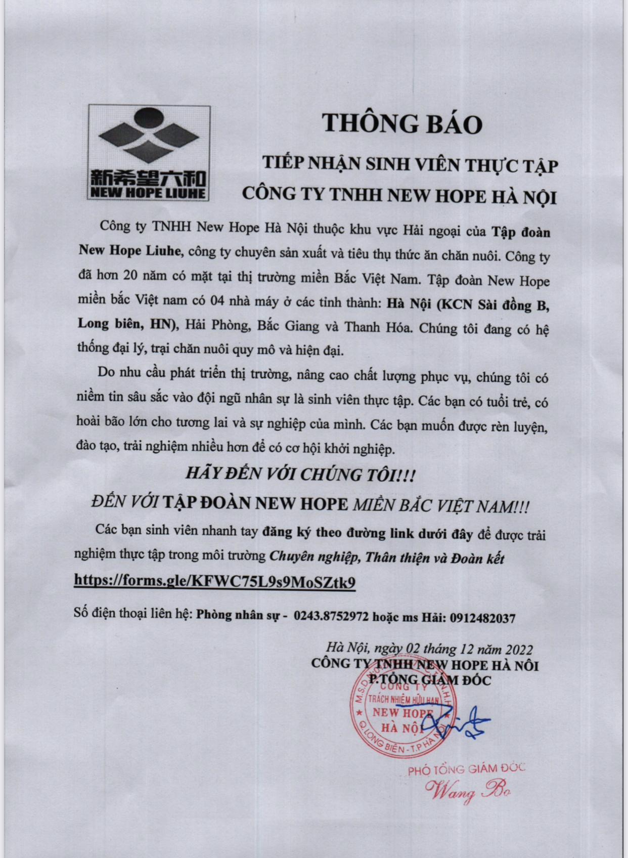 Tuyển dụng - Việc làm Tiếp nhận sinh viên thực tập- Công ty TNHH NewHope Ngày đăng: 02/12/2022 by Khoa Thú y TB THUC TAP Đăng kí tại đây https://forms.gle/uyTAPs4NahdBKBkZ8 Tin cùng thể loại VKB group Tuyển dụng Tuyển dụng – việc làm Công ty TNHH Japfa Comfeed Việt Nam thông báo tuyển dụng KHOA THÚ Y THAM DỰ HỘI THẢO QUỐC TẾ LẦN THỨ NHẤT VỀ THÚ Y, CHĂM SÓC & HUẤN LUYỆN NGỰA
