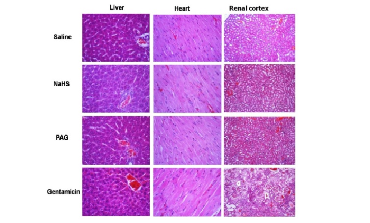 Các thay đổi mô bệnh học do Gentamicin gây ra bao gồm: thâm nhiễm tế bào viêm và hoại tử ống thận đã giảm bớt khi dùng đồng thời gentamicin với DL-propargyl glycine (P<0,05 so với đối chứng nước muối và P<0,05 so với chỉ dùng gentamicin). Tương tự, DL-propargyl glycine gây ra sự giảm đáng kể (P<0.05) trong quá trình peroxy hóa lipid, sản xuất superoxide và kích hoạt yếu tố hoại tử khối u-alpha ở động vật được điều trị bằng gentamicin. Những dữ liệu này cho thấy tác dụng bảo vệ của DL-propargyl glycine có thể liên quan ít nhất một phần đến việc giảm phản ứng viêm được quan sát thấy ở động vật được điều trị bằng cả gentamicin và DL-propargyl glycine. Do đó, các hệ thống enzym tham gia vào quá trình sinh tổng hợp hydro sunfua có thể cung cấp một mục tiêu điều trị khả thi trong việc giảm bớt tác dụng độc thận của gentamicin.