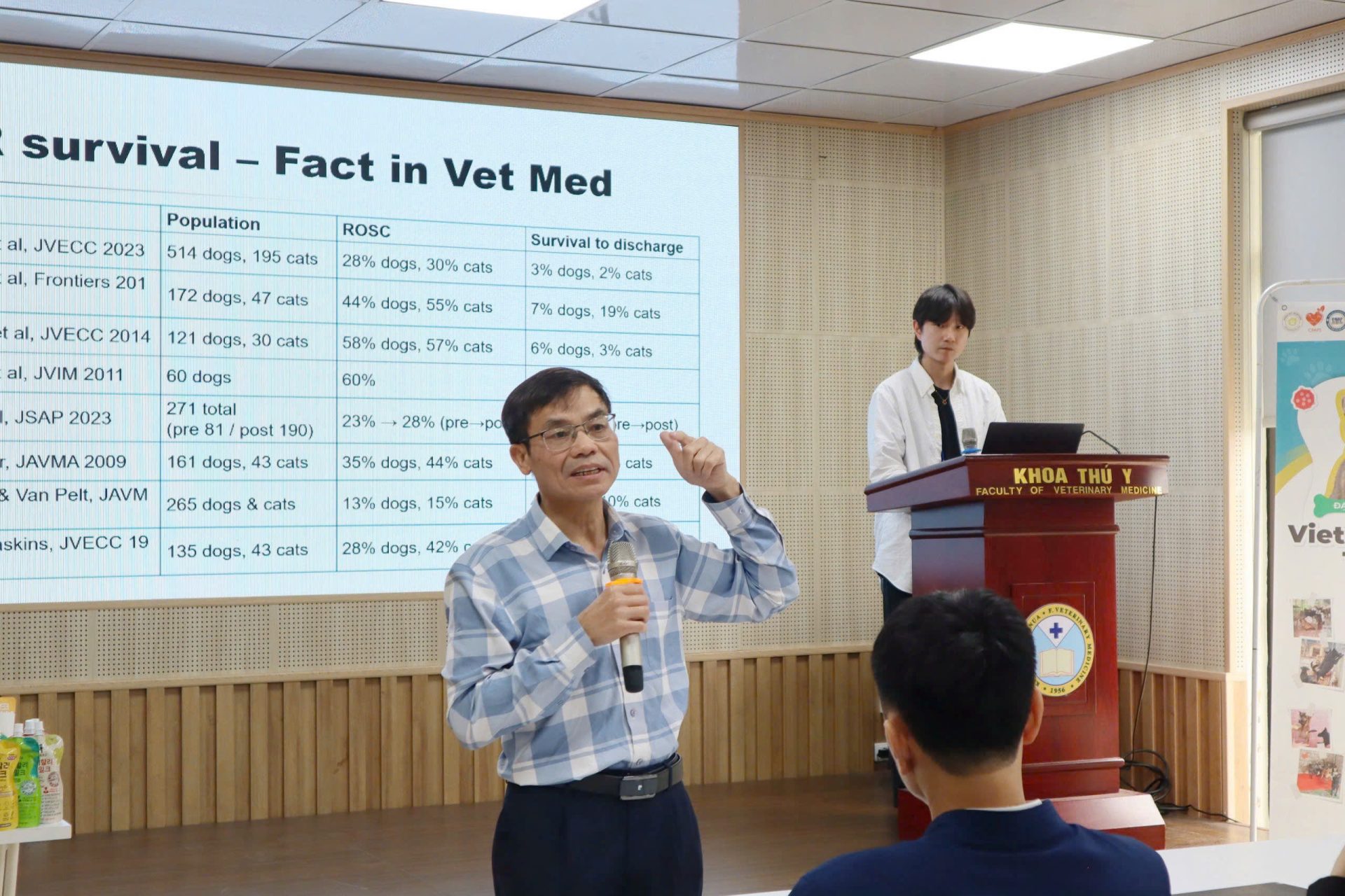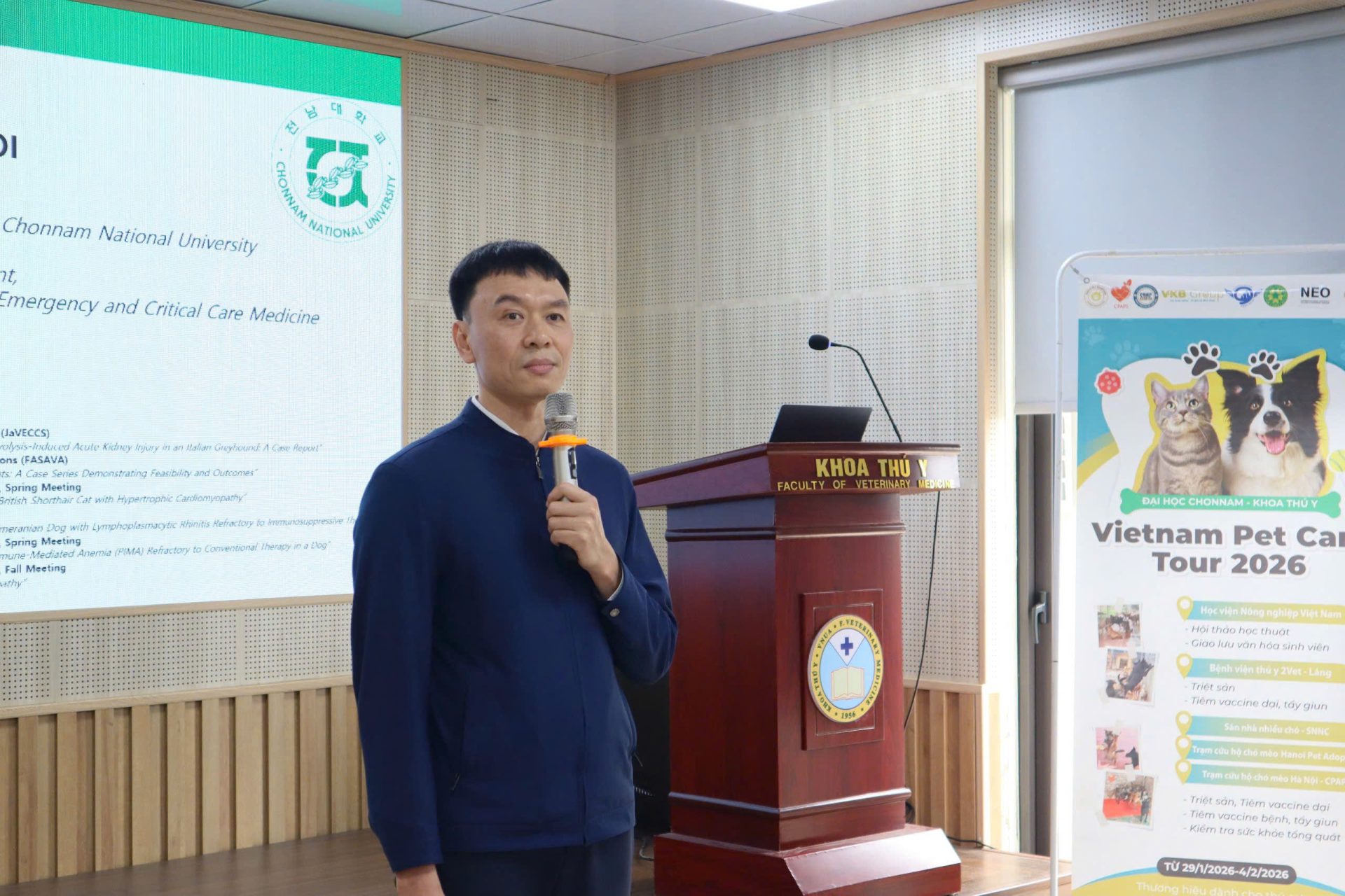 Diễn giả chính của hội thảo là bác sĩ Chonhyeon Choi, hiện là nghiên cứu sinh Tiến sĩ chuyên ngành Nội khoa Thú y và Y học Cấp cứu – Hồi sức tích cực, Khoa Thú y, Đại học Chonnam (Hàn Quốc). Trong bài trình bày, diễn giả đã chia sẻ những kiến thức cập nhật, kinh nghiệm thực hành và các tình huống lâm sàng điển hình liên quan đến kỹ thuật hồi sức tim phổi ở chó và mèo, giúp sinh viên nâng cao năng lực chuyên môn và khả năng ứng dụng trong thực tế. Nội dung hội thảo được dịch thuật chuyên môn bởi TS. Nguyễn Bá Tiếp, giảng viên Khoa Thú y, góp phần bảo đảm tính chính xác khoa học và hiệu quả trao đổi học thuật giữa các chuyên gia, bác sĩ thú y và sinh viên.