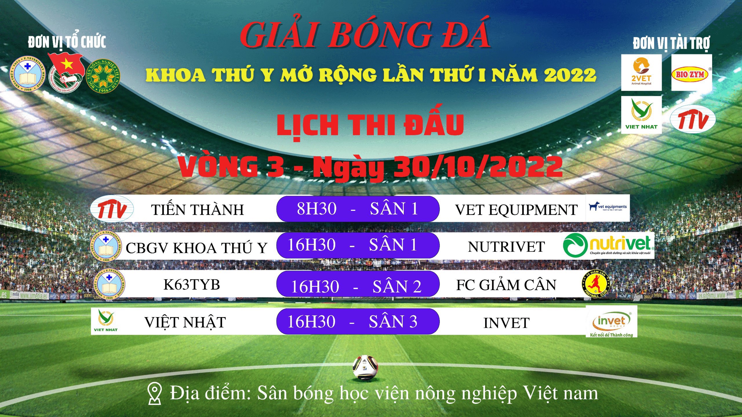 Sau vòng 2 được diễn ra vào ngày 23/10/2002. Để lại những trận đấu quyết liệt, ấn tượng đến cho khán giả và cổ động viên thì Vòng 3 của “ GIẢI BÓNG ĐÁ KHOA THÚ Y MỞ RỘNG LẦN THỨ NHẤT “ chính thức được tiếp tục diễn ra vào ngày 30/10/2022