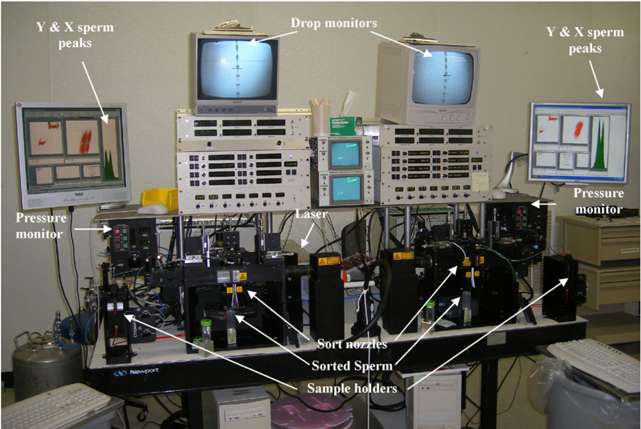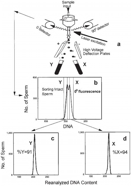 Để chọn lọc tinh trùng bằng phương pháp tách giới tính tinh bằng hệ thống Flow Cytometric Sorter, tinh trùng được đánh dấu với thuốc nhuộm huỳnh quang Hoechst 33342. Hoechst 33342 liên kết với DNA của tinh trùng. Do NST X có lượng DNA lớn hơn NST Y, vì vậy những tinh trùng mang NST X hấp phụ lượng thuốc nhuộm lớn hơn tinh trùng mang NST Y. Kết quả là, khi qua tia UV trong hệ thống Flow Cytometric Sorter, tinh trùng mang NST X sẽ phát huỳnh quang sáng hơn tinh trùng mang NST Y. Khi các tinh trùng được đi qua hệ thống Flow Cytometric Sorter, mỗi tinh trùng được bọc bằng một giọt dung dịch lỏng và tích điện tương ứng với nhiễm sắc thể giới tính mà tinh trùng mang (X tích điện dương, Y tích điện âm). Các tinh trùng mang NST X, Y được phân tách thành hai phần: Một phần mang điện tích dương (tinh trùng X), một phần mang điện tích âm (tinh trùng Y).