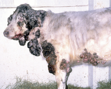 – Trên da nổi các mụn cóc to nhỏ khác nhau bị sừng hoá sần sùi màu xám hoặc nâu nhạt rải rác ở hai bên sườn, mông, vai và thường gặp ở bê, nghé 6 – 12 tháng tuổi.