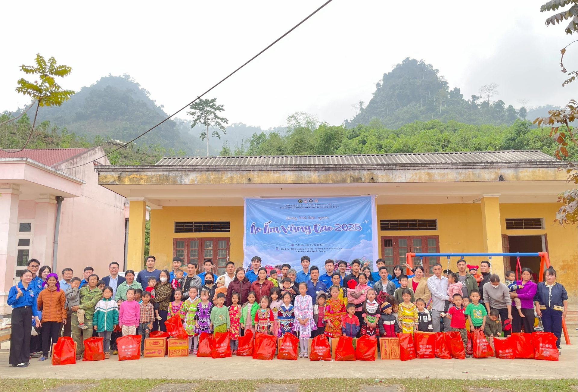 Điểm trường Tiên Tốc, trường mầm non Bình An là địa bàn còn nhiều khó khăn, điều kiện kinh tế – xã hội hạn chế, đời sống của người dân chủ yếu dựa vào sản xuất nông – lâm nghiệp quy mô nhỏ. Vào mùa đông, thời tiết khắc nghiệt càng khiến sinh hoạt và việc học tập của trẻ em, đặc biệt là học sinh mầm non, tiểu học, gặp nhiều trở ngại. Thấu hiểu thực tế đó, Chương trình “Áo ấm vùng cao 2025” được tổ chức với sự tham gia của đông đảo đoàn viên, sinh viên, cùng sự đồng hành của các thầy cô Khoa Thú y. Chương trình đã chuẩn bị và trao tặng quần áo ấm, đồ dùng học tập và một số nhu yếu phẩm thiết yếu tới các em nhỏ tại địa phương, góp phần động viên tinh thần, tiếp thêm niềm vui và sự ấm áp trong những ngày đông lạnh giá.