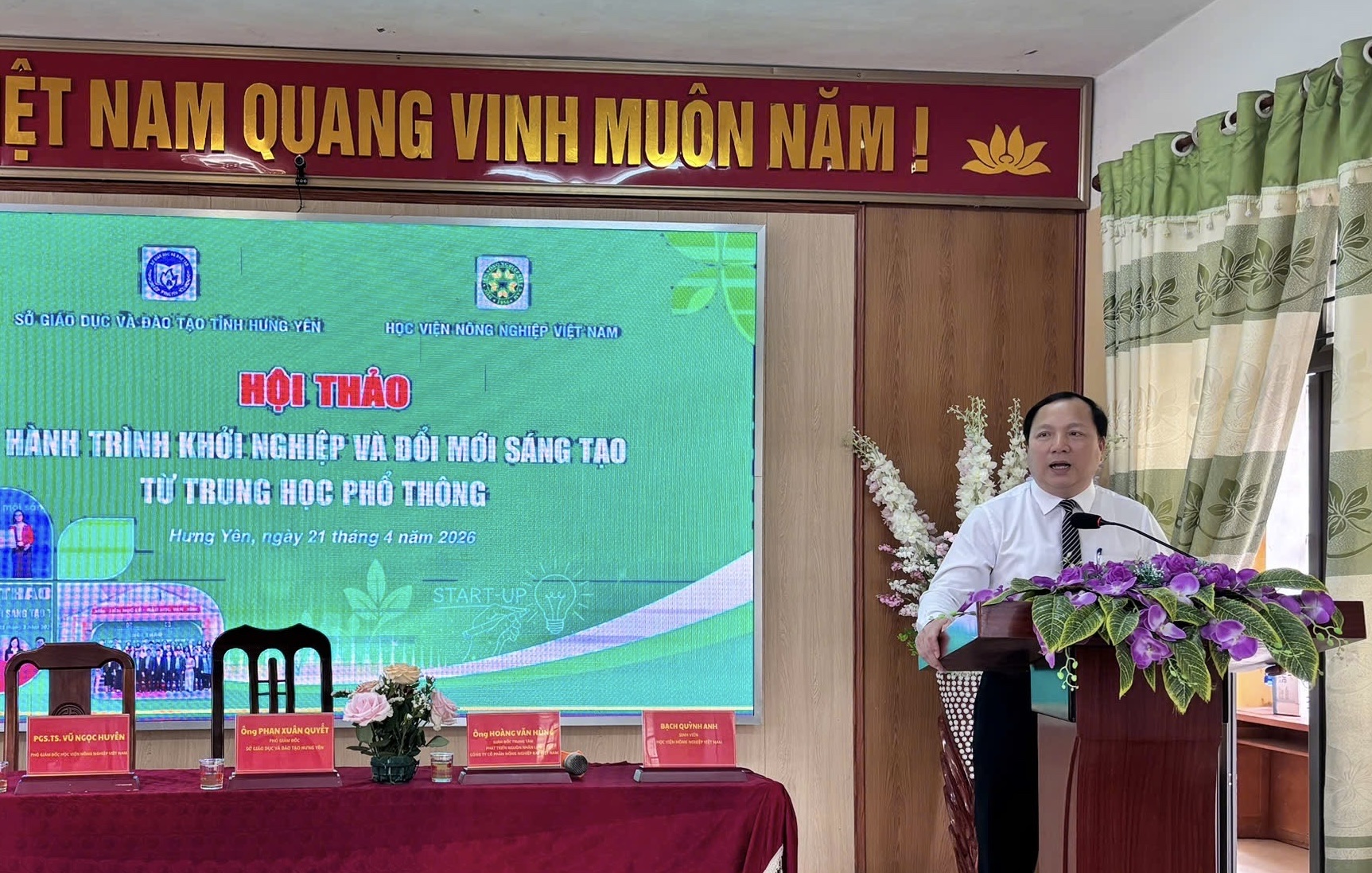 Sáng ngày 21/4/2026, Học viện Nông nghiệp Việt Nam phối hợp với Sở Giáo dục và Đào tạo tỉnh Hưng Yên tổ chức thành công Hội thảo “Hành trình khởi nghiệp và đổi mới sáng tạo từ trung học phổ thông” tại Trường THPT Tiên Lữ. Chương trình được triển khai theo hình thức kết hợp trực tiếp và trực tuyến qua nền tảng Zoom, thu hút sự tham gia đông đảo của học sinh, giáo viên và các đại biểu đến từ nhiều điểm cầu trên toàn tỉnh.
