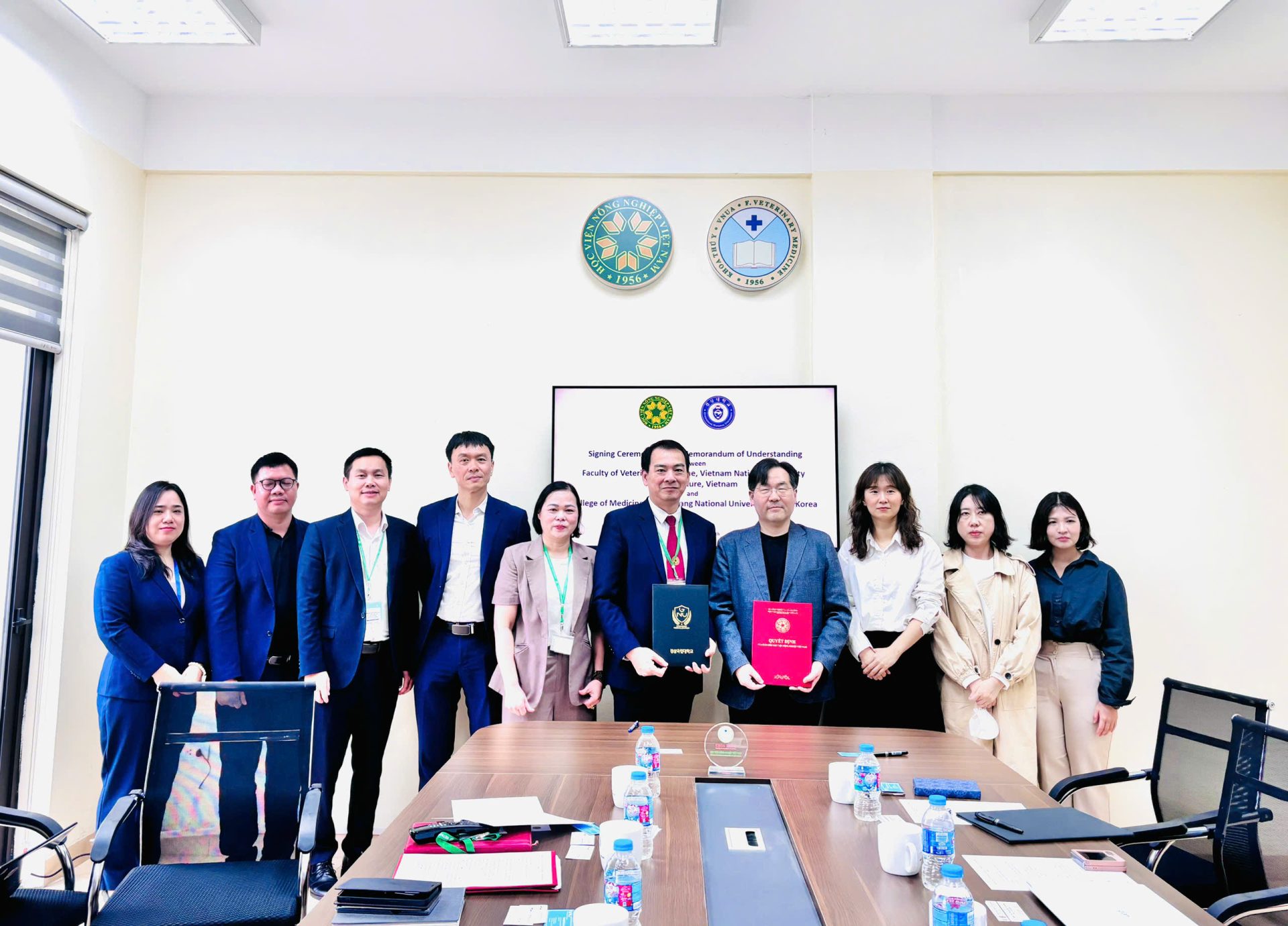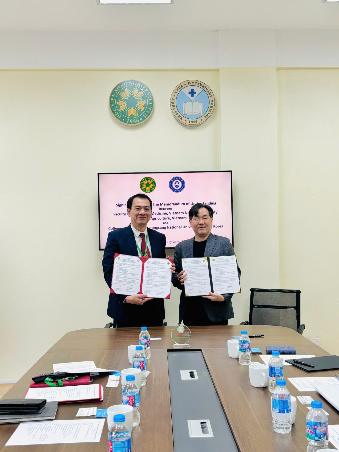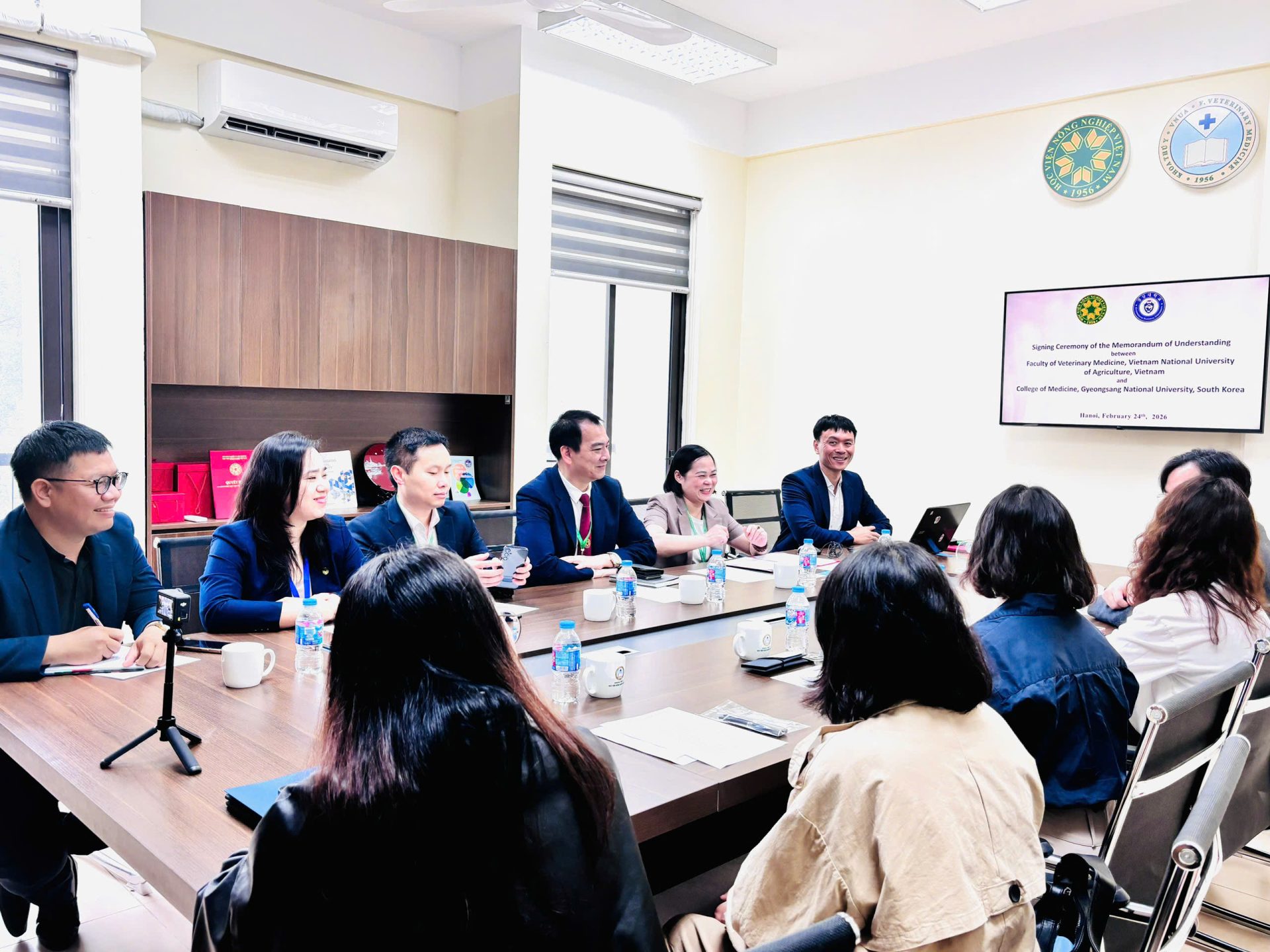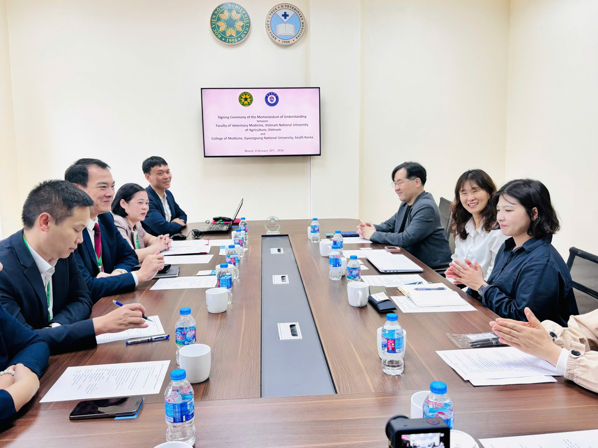 Sáng ngày 24/02/2026, tại Khoa Thú y – Học viện Nông nghiệp Việt Nam đã diễn ra buổi gặp gỡ và làm việc giữa Khoa Thú y với Đại học Quốc gia Gyeongsang (GNU) và Công ty NPChemBio Inc. (Hàn Quốc). Đây là hoạt động hợp tác quốc tế quan trọng, mở đầu cho năm mới 2026 với nhiều kỳ vọng về phát triển đào tạo, nghiên cứu khoa học và chuyển giao công nghệ trong lĩnh vực thú y.