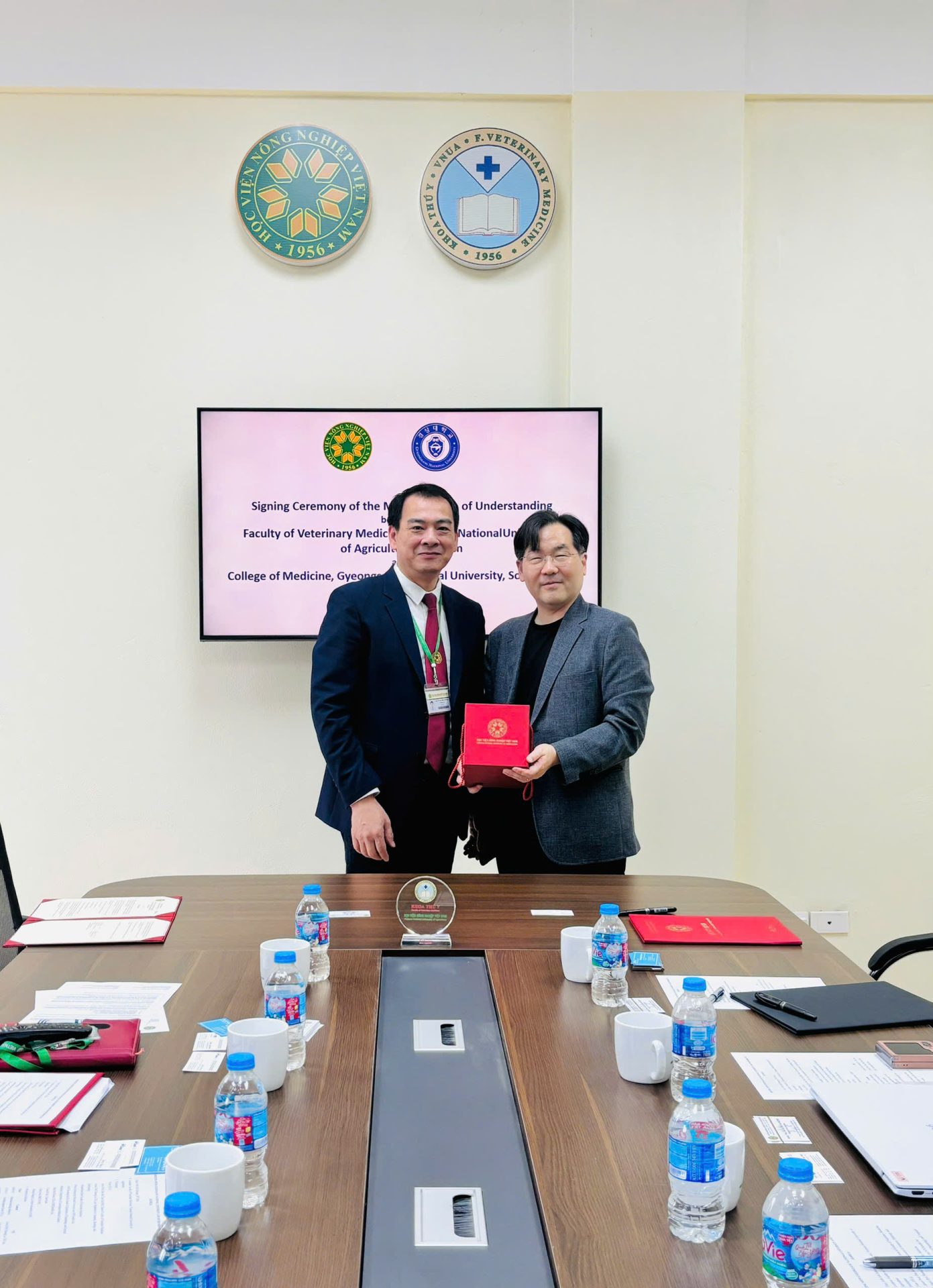 Mở đầu chương trình PGS. TS. Bùi Trần Anh Đào – Trưởng khoa gửi lời chào mừng nồng nhiệt tới đoàn đại biểu Hàn Quốc, bày tỏ mong muốn thiết lập mối quan hệ hợp tác lâu dài, bền vững giữa các bên trong đào tạo, nghiên cứu và trao đổi học thuật. Tiếp đó, PGS. TS. Lai Thị Lan Hương đã giới thiệu mục tiêu cuộc họp, nhấn mạnh ý nghĩa của việc tăng cường hợp tác quốc tế trong bối cảnh hội nhập và phát triển khoa học công nghệ. Đại diện cho đoàn Hàn Quốc, GS. Byoung-Kuk Na đã phát biểu chia sẻ về định hướng nghiên cứu của GNU, đặc biệt trong lĩnh vực Ký sinh trùng và Y học nhiệt đới, đồng thời bày tỏ kỳ vọng vào các chương trình hợp tác nghiên cứu chung, trao đổi giảng viên và sinh viên trong tương lai. Một dấu mốc quan trọng của buổi làm việc là Lễ ký thỏa thuận hợp tác giữa Khoa Thú y – Học viện Nông nghiệp Việt Nam và Đại học Quốc gia Gyeongsang (Hàn Quốc). Hoạt động này đánh dấu bước tiến mới trong quan hệ hợp tác và tạo nền tảng pháp lý cho các hoạt động hợp tác chuyên sâu trong thời gian tới. Chương trình khép lại bằng hoạt động tham quan phòng thí nghiệm của khoa Thú y, Học viện Nông nghiệp Việt Nam, giúp đoàn Hàn Quốc hiểu hơn về cơ sở vật chất, trang thiết bị và năng lực nghiên cứu của Khoa.