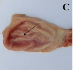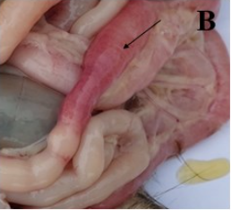 | Hình B. Ruột sung huyểt, xuất huyết rải rác hoặc từng đoạn ngắn | Hình C. Dạ dày sung huyết chứa nhiều dịch |