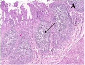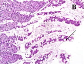 | Hình A. Nang lympho thành ruột tăng xinh (X100) | Hình B. Tế bào biểu mô ruột thoái hoá (X400) |