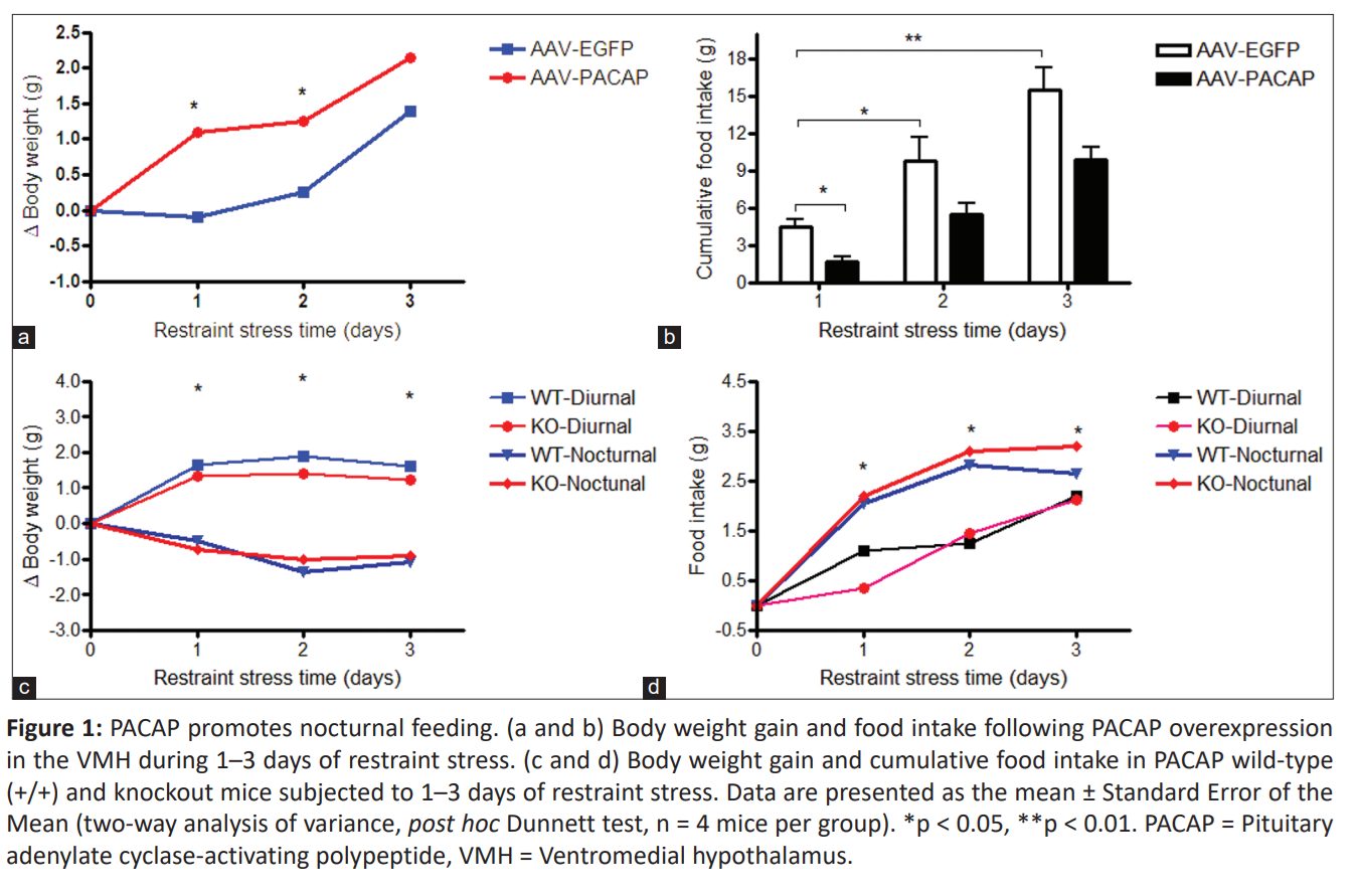 Kết quả: Sự tăng biểu hiện PACAP tại VMH làm tăng đáng kể hành vi ăn vào ban đêm, cho thấy tác động đặc hiệu theo nhịp sinh học trong điều hòa cảm giác thèm ăn. Căng thẳng mạn tính làm tăng lượng thức ăn tiêu thụ ở cả chuột PACAP KO và WT, trong khi căng thẳng cấp tính không gây ảnh hưởng, chứng tỏ hiện tượng ăn quá mức do căng thẳng mạn tính xảy ra độc lập với tín hiệu PACAP. Về mặt hành vi, chuột tăng biểu hiện PACAP thể hiện thời gian bất động giảm trong các thử nghiệm bơi cưỡng bức và treo đuôi, phản ánh khả năng chống chịu căng thẳng cao hơn và hiệu ứng tương tự thuốc chống trầm cảm. Đáng chú ý, mức biểu hiện thụ thể PAC1 vẫn ổn định trong suốt chu kỳ ngày – đêm, cho thấy các tác động điều hòa của PACAP chủ yếu phụ thuộc vào mức độ sẵn có của neuropeptid hơn là sự biến đổi của thụ thể.