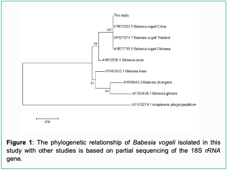 Hình ảnh 1: Mối quan hệ phát sinh loài của Babesia vogeli được phân lập trong nghiên cứu này với các nghiên cứu khác dựa trên giải trình tự từng phần của gen 18S rRNA.